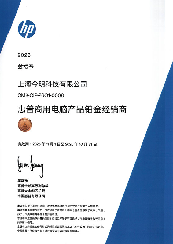 查看詳情惠普商用電腦產品鉑金經銷商證書-今明科技2026